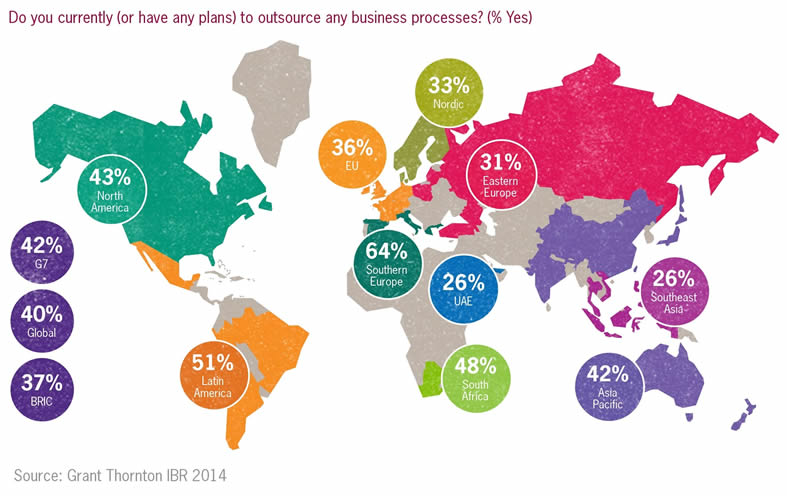 Two in five mid-market businesses around the world either currently outsource a back-office process, or plans to in the near future. That is the key finding from our new report - Outsourcing: driving efficiency and growth - which looks to better understand attitudes to outsourcing: Why and what functions are businesses outsourcing? What is preventing businesses from outsourcing? And how can these obstacles can be overcome?