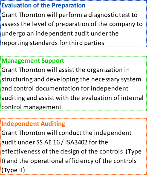 In order to help the service organization and its users to establish a reliable and standard process for the service organization's reports, we offer the following services: